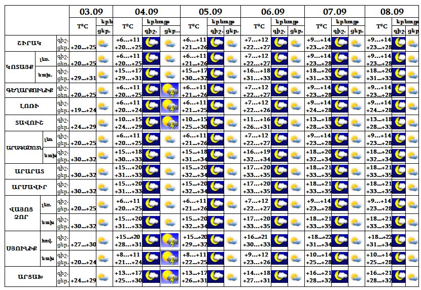 Սեպտեմբերի 3-ի ցերեկը, 5-8-ը սպասվում է առանց տեղումների եղանակ, 4-ին՝ կեսօրից հետո, Լոռիում, Տավուշում, Գեղարքունիքում, Սյունիքում և Արցախում սպասվում է կարճատև անձրև և ամպրոպ: