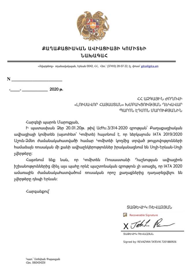 «Ընթացք տալով ձեր դիմումներին, երկու շաբաթ առաջ դիմել էի ՀՀ քաղաքացիական ավիացիայի կոմիտեի նախագահ Տաթևիկ Ռևազյանին՝ հետևյալ հարցի կապակցությամբ.