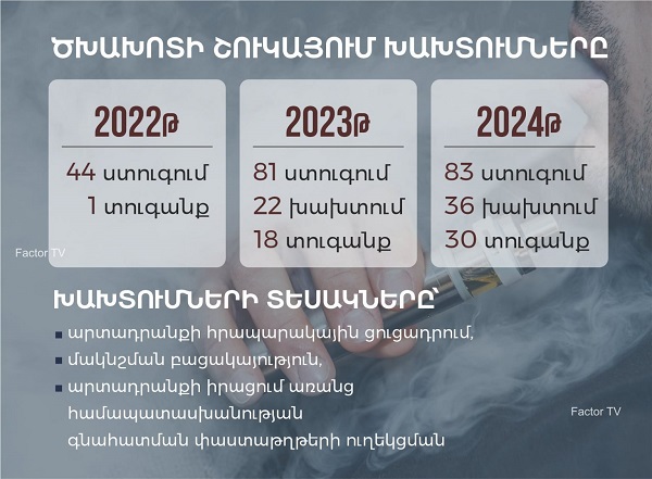 Ծխախոտային արտադրանքի և փոխարինիչների վաճառքի սահմանափակումները վերահսկում է Շուկայի վերահսկողության տեսչական մարմինը, որը, սակայն, ստուգում է միայն փաստաթղթերի առկայությունը, վաճառքի ցուցափեղկերի փակ լինելը և մակնշումը, իսկ բաղադրության և ապրանքի անվտանգության հարցերը տեսչական մարմնի իրավասությունից դուրս են։ Factor.am-ը տեսչական մարմնից պարզել է, որ առանց համապատասխանության գնահատման փաստաթղթերի ուղեկցման արտադրանքի իրացման, դրա հրապարակային ցուցադրման, մակնշման բացակայության խախտումների համար 2023-ին՝ 18, իսկ 2024-ին 30 տնտեսվարող է տուգանվել։ Նշենք, որ տարբեր ծխախոտային արտադրատեսակների փոխարինիչների մասով տարանջատված տվյալների բազա տեսչական մարմինը չի վարում։