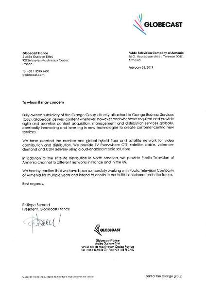 Գլոբքաստը արբանյակային կապուղի ապահովող խոշոր ընկերություն է, որի հետ գործակցում են բազմաթիվ կազմակերպություններ: Հանրայինը Գլոբքաստի հետ ևս գործող պայմանագիր ունի, ինչի շնորհիվ հաղորդումները հասանելի են դառնում նշված երկրներում: Արդեն 5 տարի ԱՄՆ Կալիֆորնիա նահանգում Հանրայինի հաղորդումները հեռարձակվում են նաև Պանարմենիան հեռուստաընկերության եթերում՝ 2014 թվականին Հեռուստաընկերության և Պանարմի միջև կնքված վերահեռարձակման իրավունքի տրամադրման պայմանագրով: