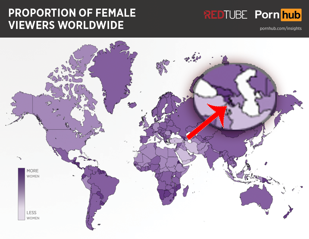 Եվ այսպես, ինչքան էլ անսպասելի է, սակայն Հայաստանից կանայք ամենաշատը նայել են լեսբիների մասնակցությամբ 18+ վիդեոներ։ Քարտեզը ստորև կտեսնեք։ Մանուշակագույն գույնով ներկված է Հայաստանի տարածքը, որը համապատասխանում է լեսբի վիդեոների գույնին գրաֆիկայում։