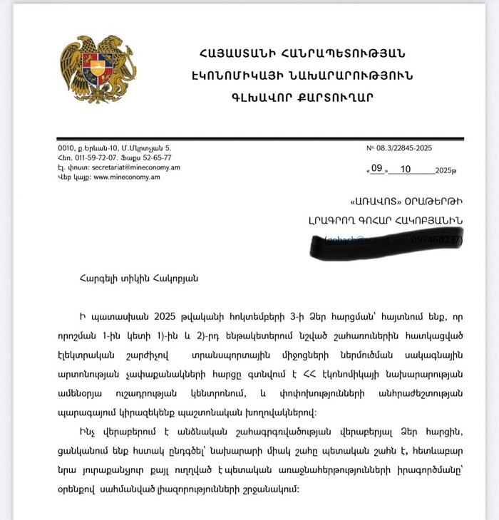 Առավոտ.am-ին ԿԳՄՍ նախարարությունից գրավոր պատասխանել են, որ էլեկտրային շարժիչով տրանսպորտային միջոցների ներմուծման սակագնային արտոնության չափաքանակների հարցը գտնվում է էկոնոմիկայի նախարարության ամենօրյա ուշադրության կենտրոնում, եւ փոփոխությունների անհրաժեշտության պարագայում կիրազեկեն պաշտոնական խողովակներով: