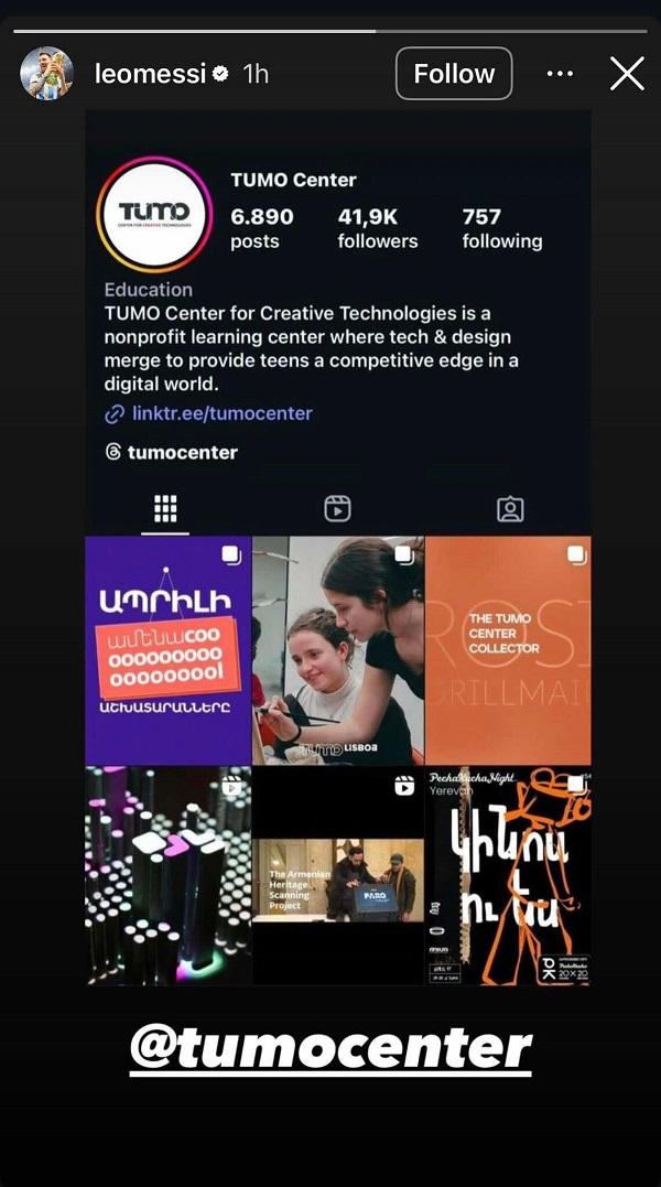 Լիոնել Մեսսին իր ինստագրամյան էջի սթորի բաժնում պատմել է Թումոյի մասին և լուսանկարներ ներկայացրել։