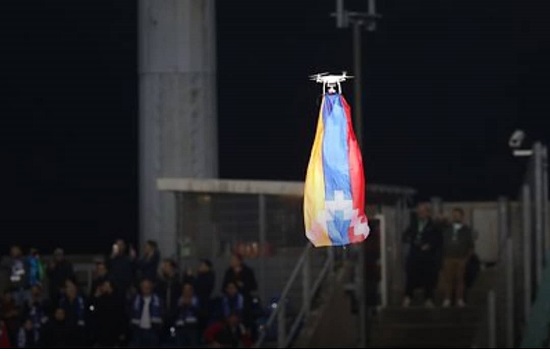 The drone, which was carrying the red, blue and gold flag, was then flown over the halfway line where it hovered for several seconds, over the heads of players from both teams.