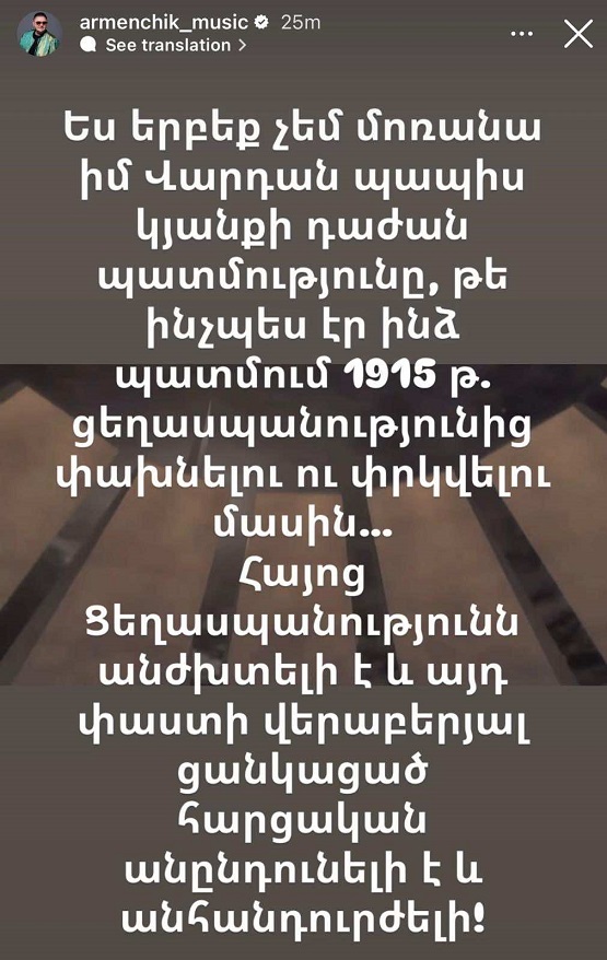 Ես երբեք չեմ մոռանա իմ Վարդան պապիս կյանքի դաժան պատմությունը, թե ինչպես էր ինձ պատմում 1915 թվի ցեղասպանությունից փախնելու ու փրկվելու մասին․․․Հայոց ցեղասպանությունն անժխտելի է և այդ փաստի վերաբերյալ ցանկացած հարցական՝ անընդունելի և անհանդուրժելի,-գրել է երգիչ Արմենչիկը սոցիալական ցանցերի իր էջերում՝ այդպիսով արձագանքելով   Վարդան Ղուկասյանի կոչին։