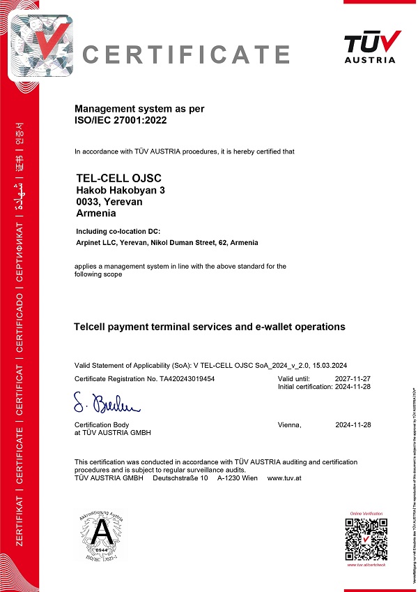 Telcell ընկերությունը մեծապես կարևորում է իր գործունեության անվտանգությունը և հենց այդ նպատակով էլ ստացել է ISO/IEC 27001:2022 հավաստագիր։