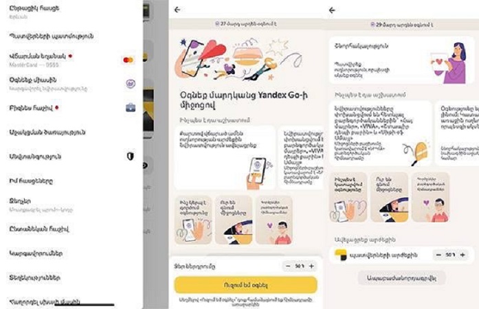 Այժմ Հայաստանում դուք կարող եք օգնել բարեգործական կազմակերպություններին Yandex Go հավելվածի միջոցով: Նոր «Օգնենք միասին» բաժնում օգտատերերը կարող են ընտրել, թե որքան գումար են ցանկանում փոխանցել աջակցության համար, որն էլ կավելացվի ընթացիկ ուղևորության արժեքին: Յուրաքանչյուր ամսվա վերջում Yandex Go-ն իր կողմից կկրկնապատկի նվիրատվությունների միջոցով հավաքված գումարը՝  մեծացնելով իր ներդրումը բարեգործական կազմակերպություններին։
