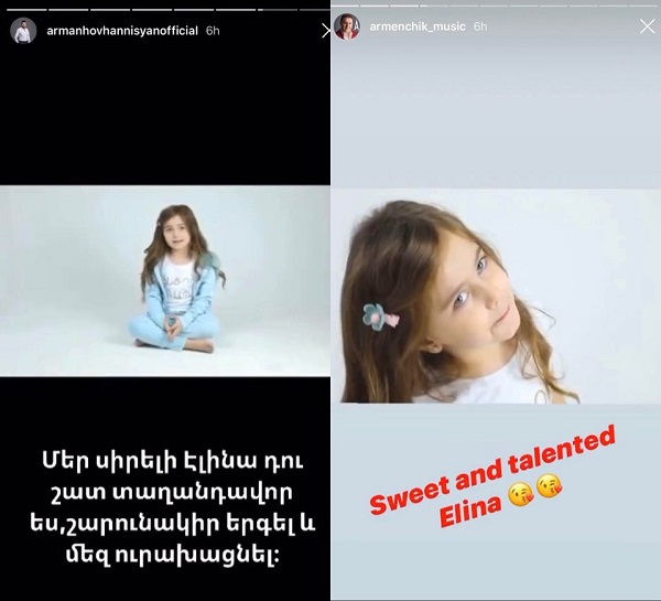-Մեր սիրելի Էլինա, դու շատ տաղանդավոր ես, շարունակիր երգել և ուրախացնել մեզ,-գրել է Արման Հովհաննիսյանը։